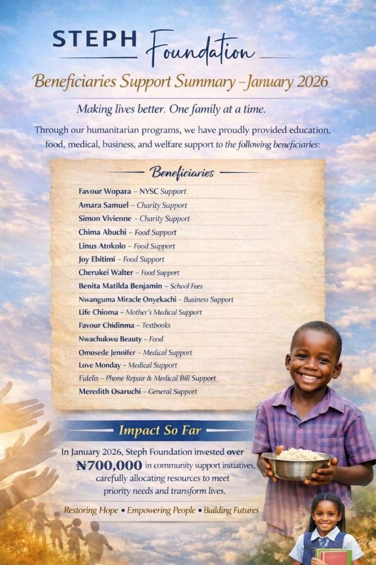 Steph Foundation is one of the largest privately-owned humanitarian organization’s in Port Harcourt, Rivers State, Nigeria, with the goodwill of the foundation activities reaching outside and within the shores of the country, through varying platforms, that has been to be effective over the years.